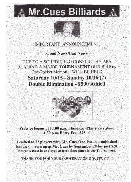 Don't miss out on the Bill Roy One Pocket memorial tournament. October 15th-16th. Come out to remember our great friend Bill. See flyer below for more details.